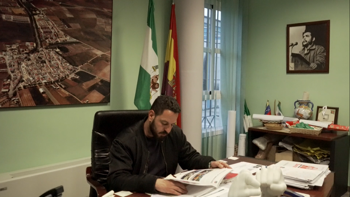 En el despacho del alcalde, donde las bandera republicana y andaluza ondean con orgullo desde hace décadas, un mapa de las tierras de Marinaleda cuelga en la pared junto a una foto del Che Guevara.