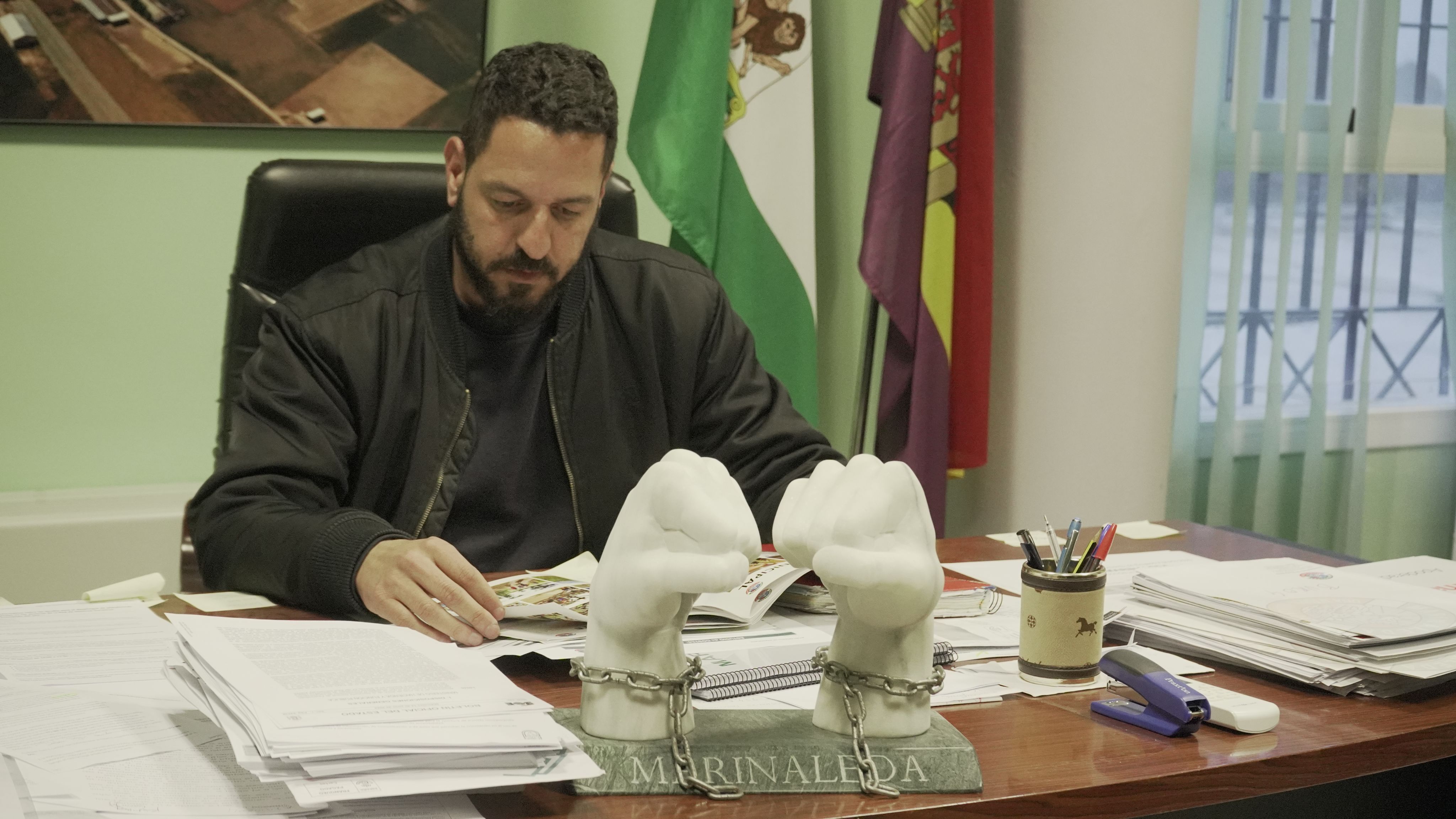 En medio de miles de papeles dispersos por la mesa, destaca una escultura de dos manos encadenadas con los puños cerrados sobre el nombre de Marinaleda. En este entorno cargado de simbolismo, Sergio Gómez reafirma su compromiso con el diálogo, aunque advierte con determinación: "Si la Junta no es capaz de ofrecer una solución viable a este conflicto, pasaremos a la acción. Nuestra historia está marcada por la lucha, la movilización y el boicot, y eso nos ha llevado a donde estamos hoy".