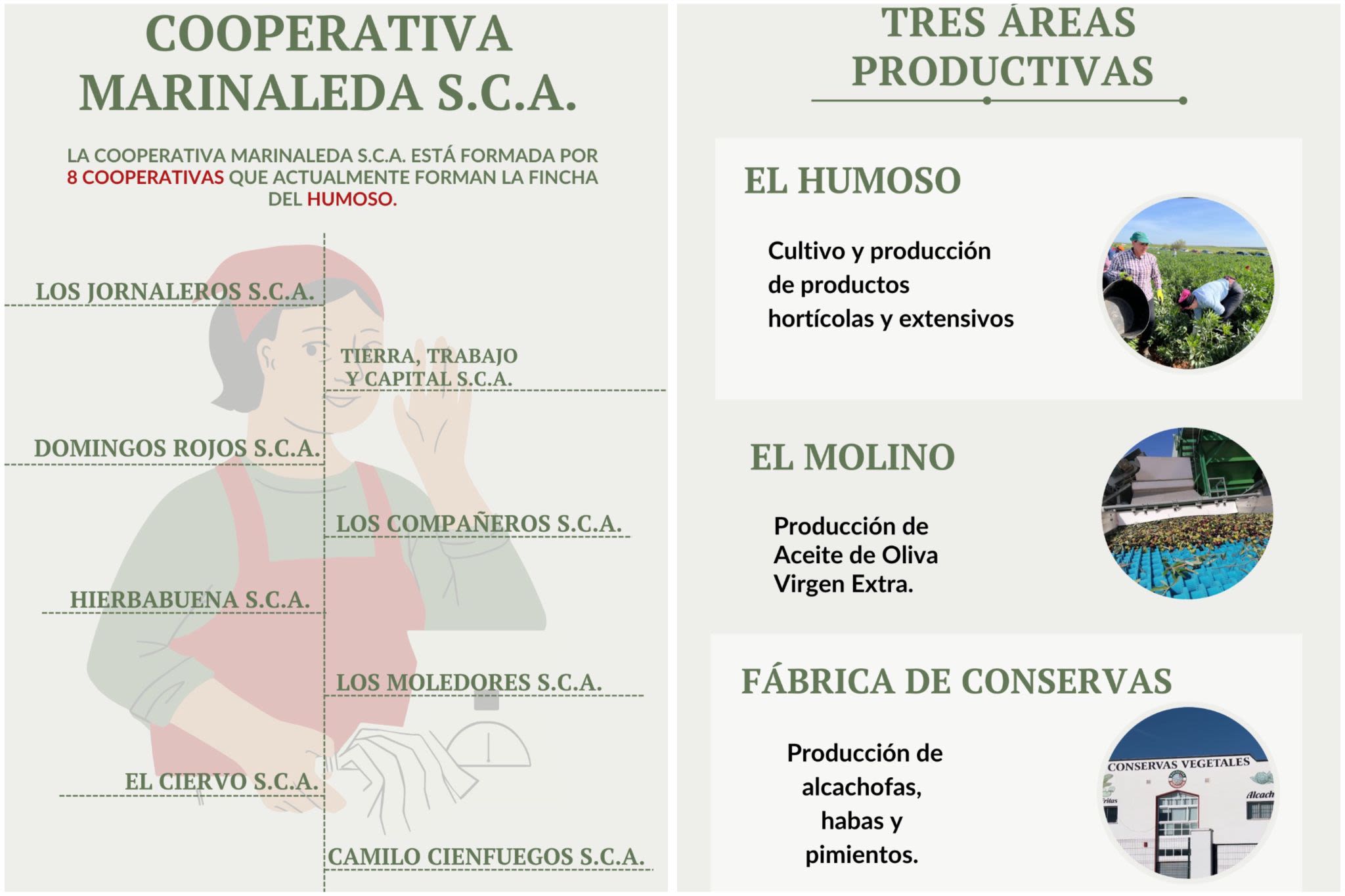 Situado en una carretera de Écija, el cortijo El Humoso representa el pulmón económico de Marinaleda. Esta finca, cedida a la Cooperativa Marinaleda SCA, no solo cuenta con tierras de cultivo, sino también con un molino de aceite y una fábrica de conservas. La cooperativa, cuyo origen se remonta a las luchas jornaleras de los ochenta, es un proyecto colectivo cuyo objetivo es la generación de empleo digno mediante la venta de productos agrícolas. Estas tierras representan la fuente principal de trabajo en el pueblo.